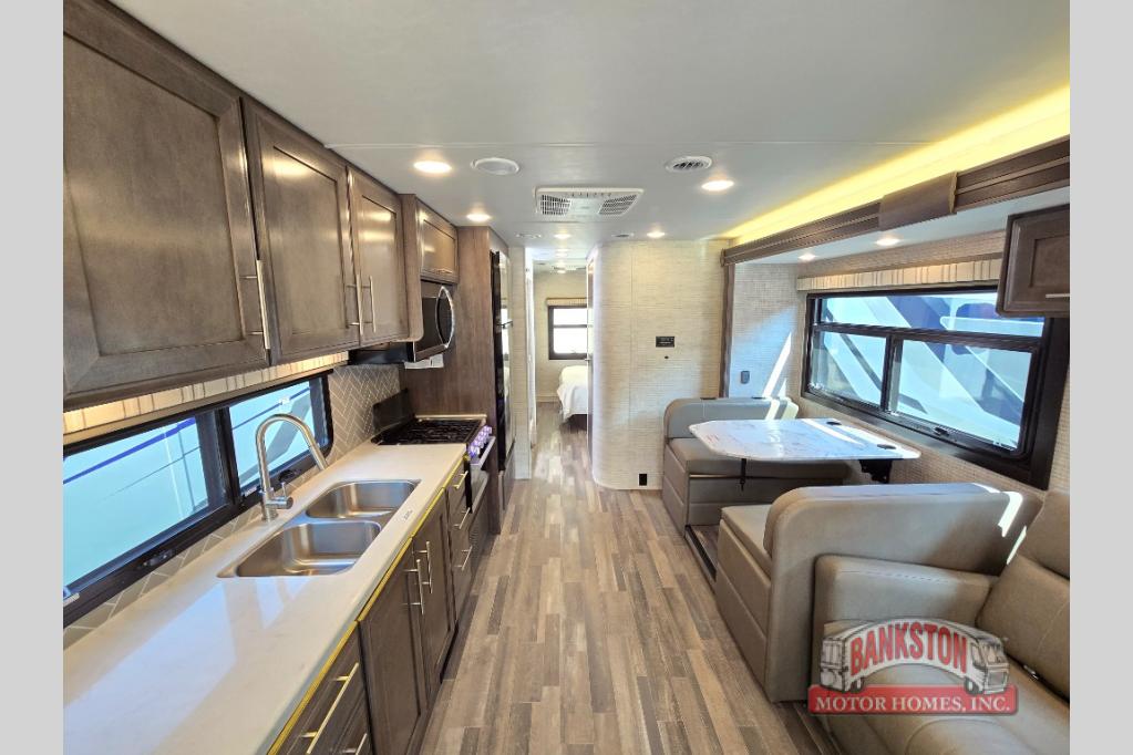 Step inside, and you’ll be greeted by an interior that feels more like a modern home than an RV. The solid-surface countertops, residential-style cabinetry, and spacious living areas create a luxurious yet practical environment. Love to cook? The fully-equipped kitchen includes a recessed cooktop, microwave, and ample storage for all your culinary adventures.