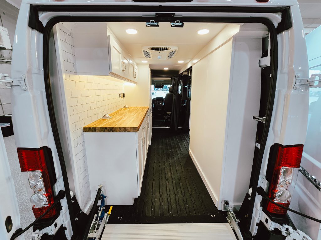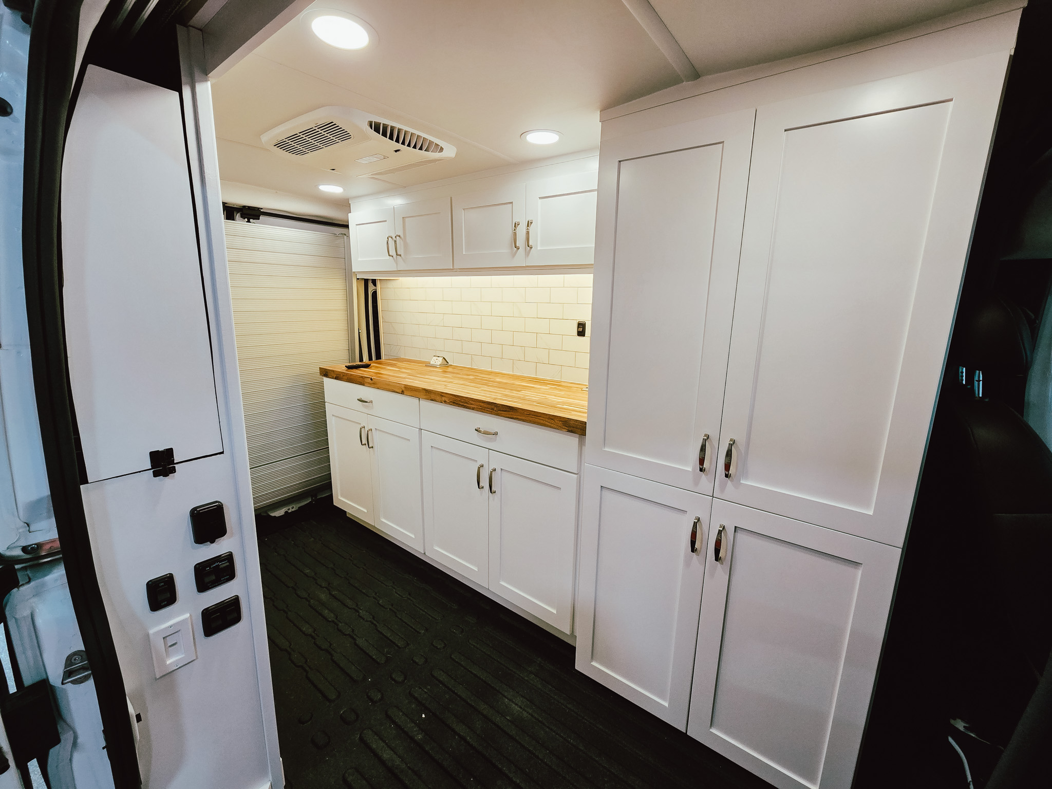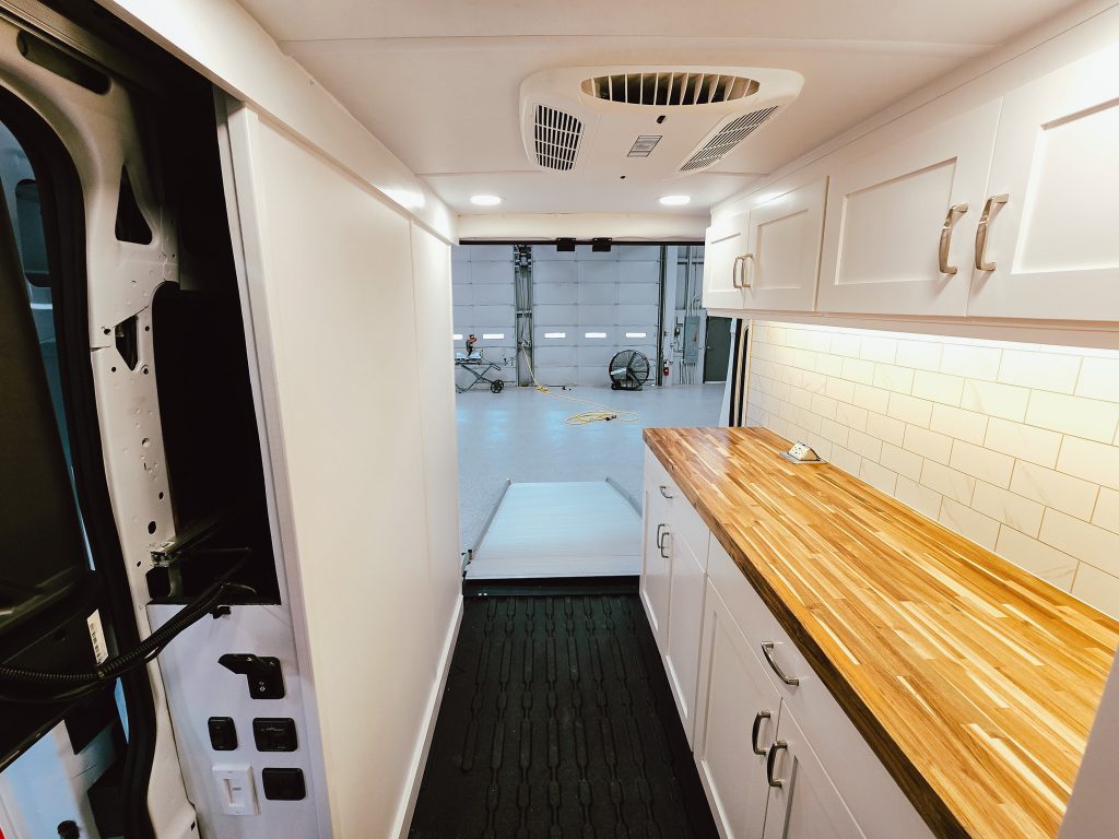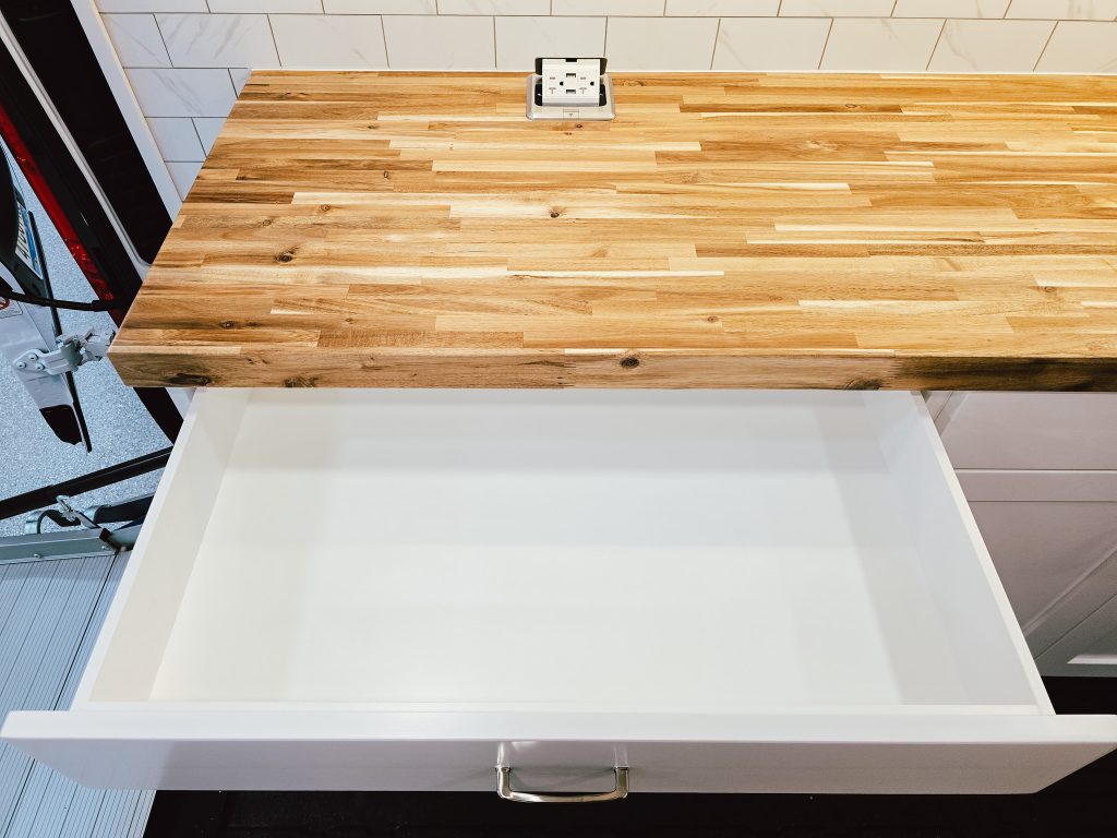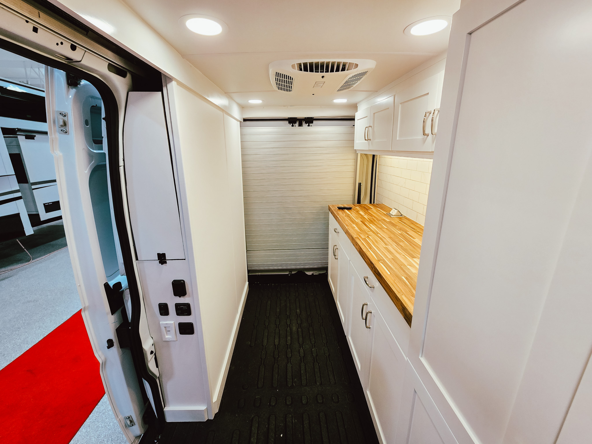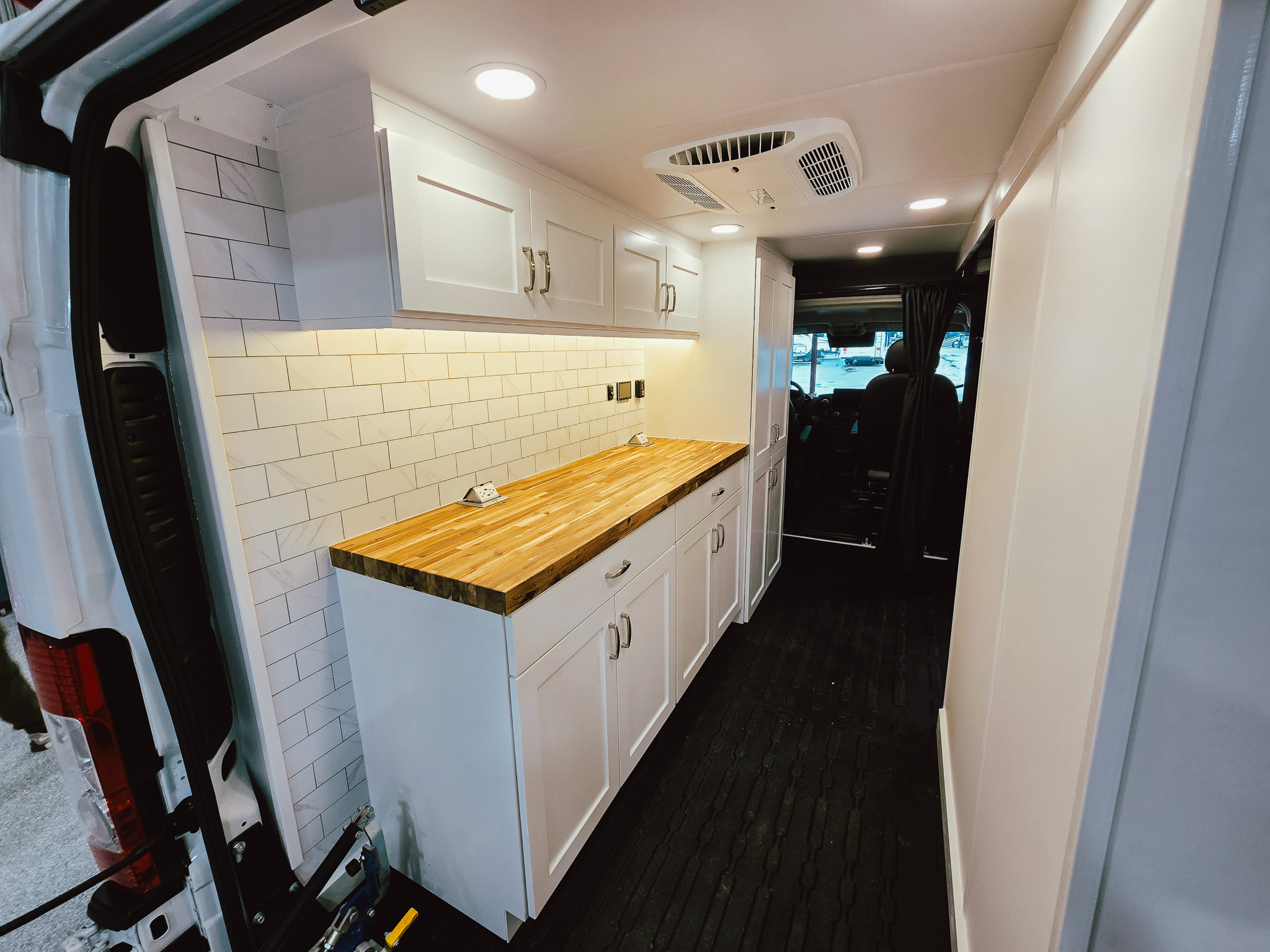 - Butcher Block Countertops: Sleek countertops feature two 15-amp receptacles and USB ports for charging laptops, phones, or tablets, turning the van into a mobile office.