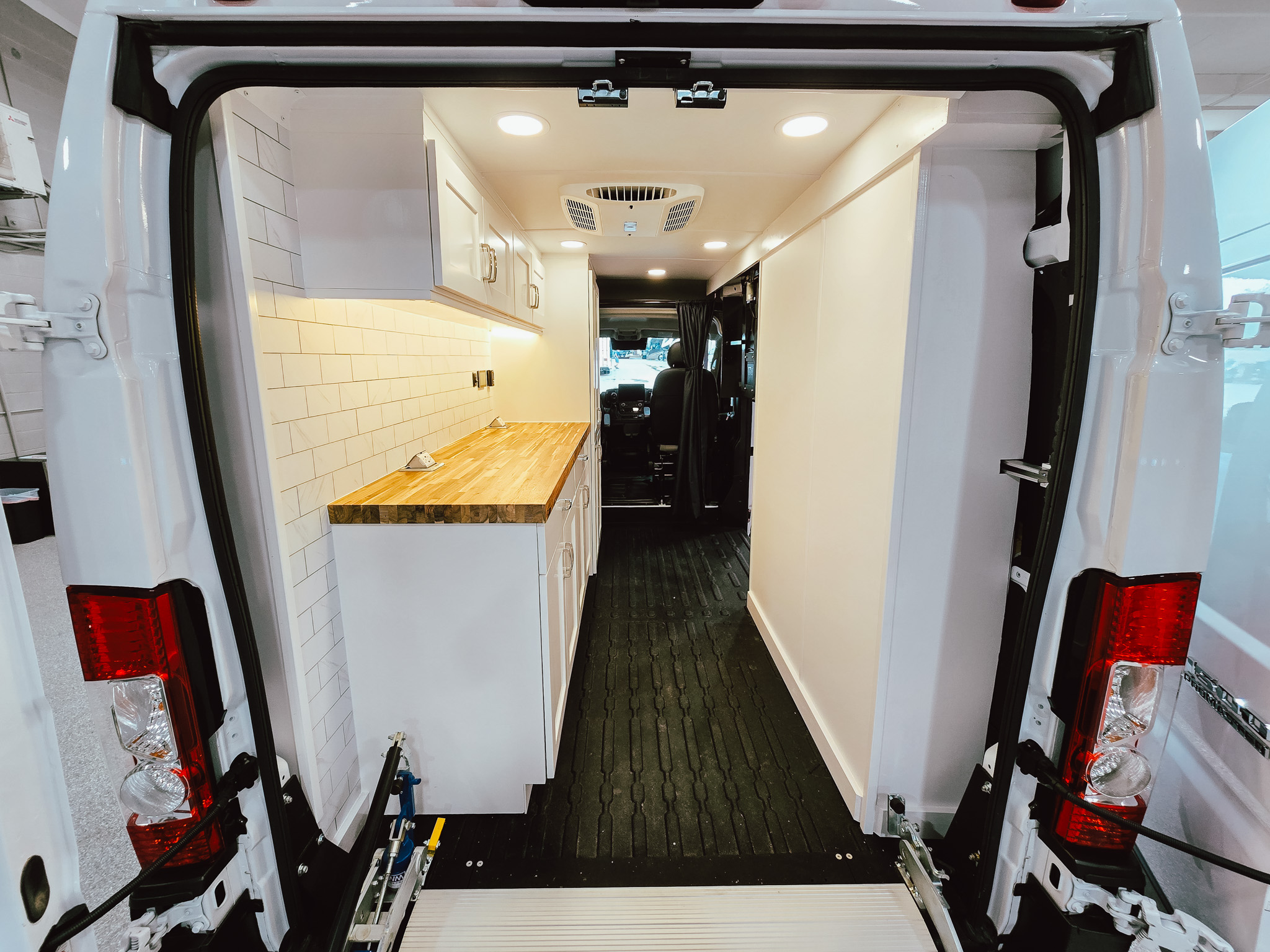 The van’s interior was a blank slate with a painted factory floor. Our service department built a residential-quality space from scratch, tailored to the customer’s needs.