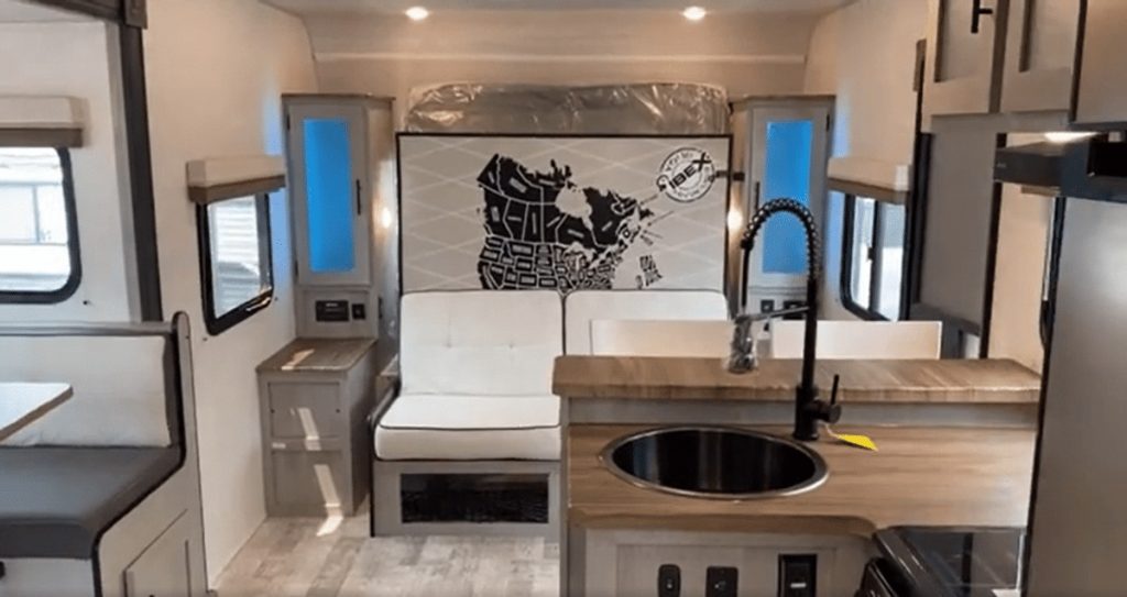 However, for those who prefer a traditional bed, Ibex’s design allows you to swap out the murphy bed for a residential queen mattress of your choice. The murphy bed section also doubles as additional storage, further enhancing the RV’s practicality.