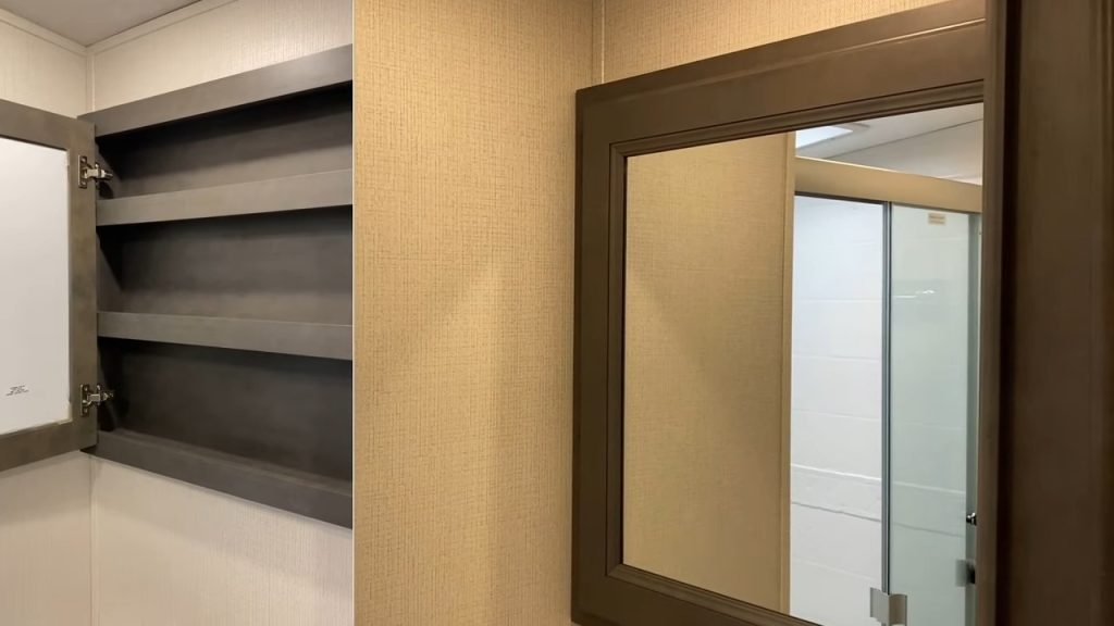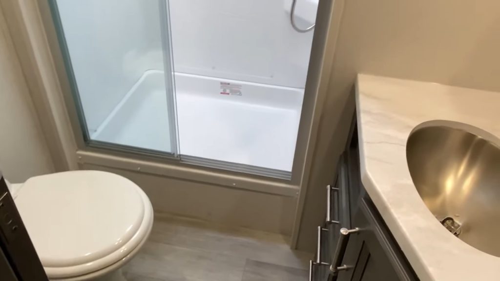 The bathroom is spacious, with plenty of room around the toilet and headroom in the shower. As you can see above, Josh the RV Nerd fits comfortably in the shower, and he is over 6 feet tall.
