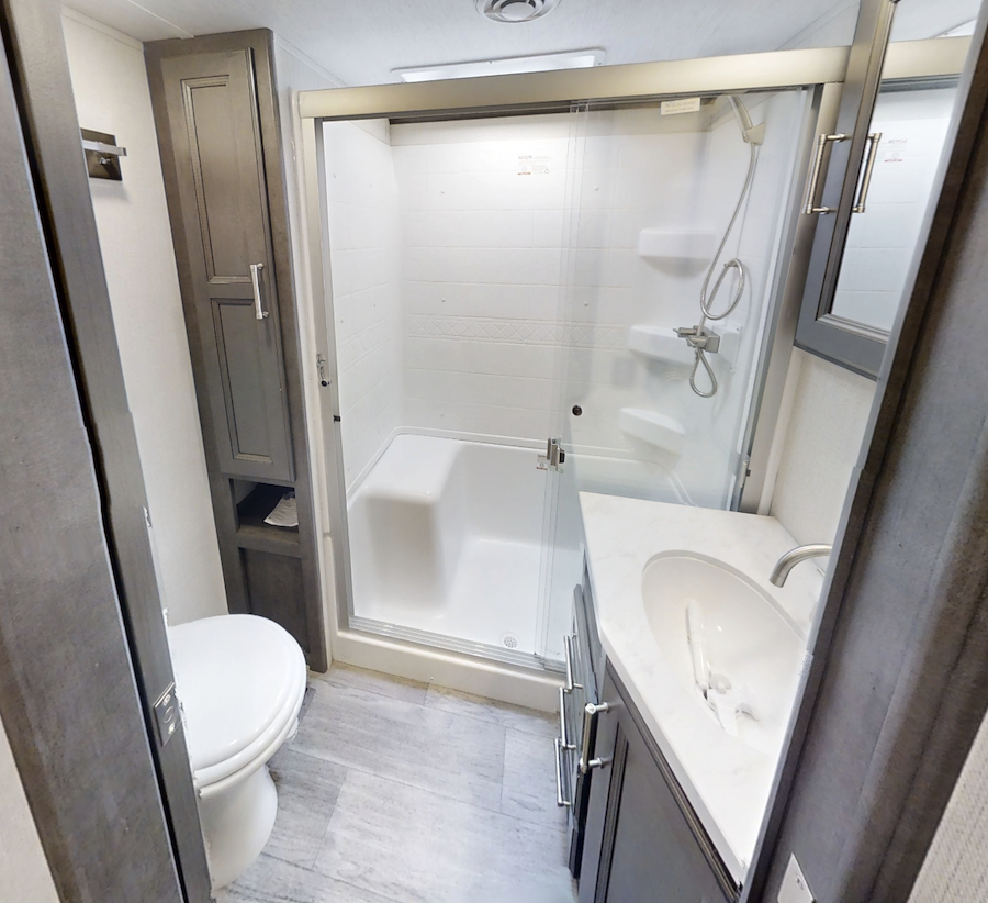 The 260MLE has A+ travel access. The sink, fridge, and most of the cabinets are easy to access with the slides in. There is so much space you won’t even need to squeeze.