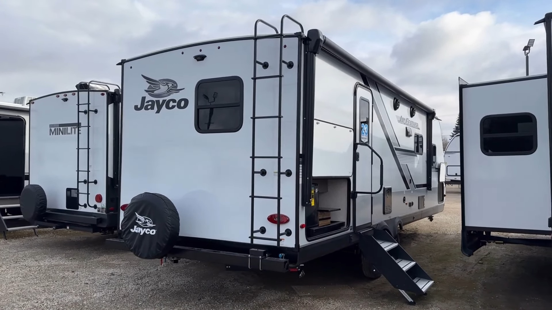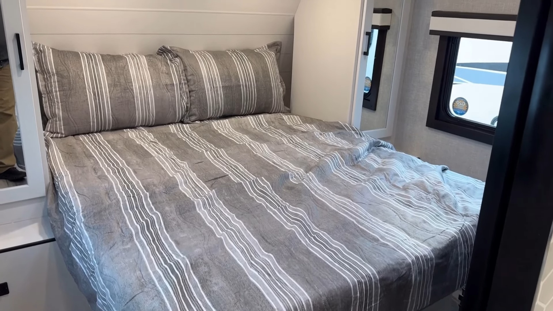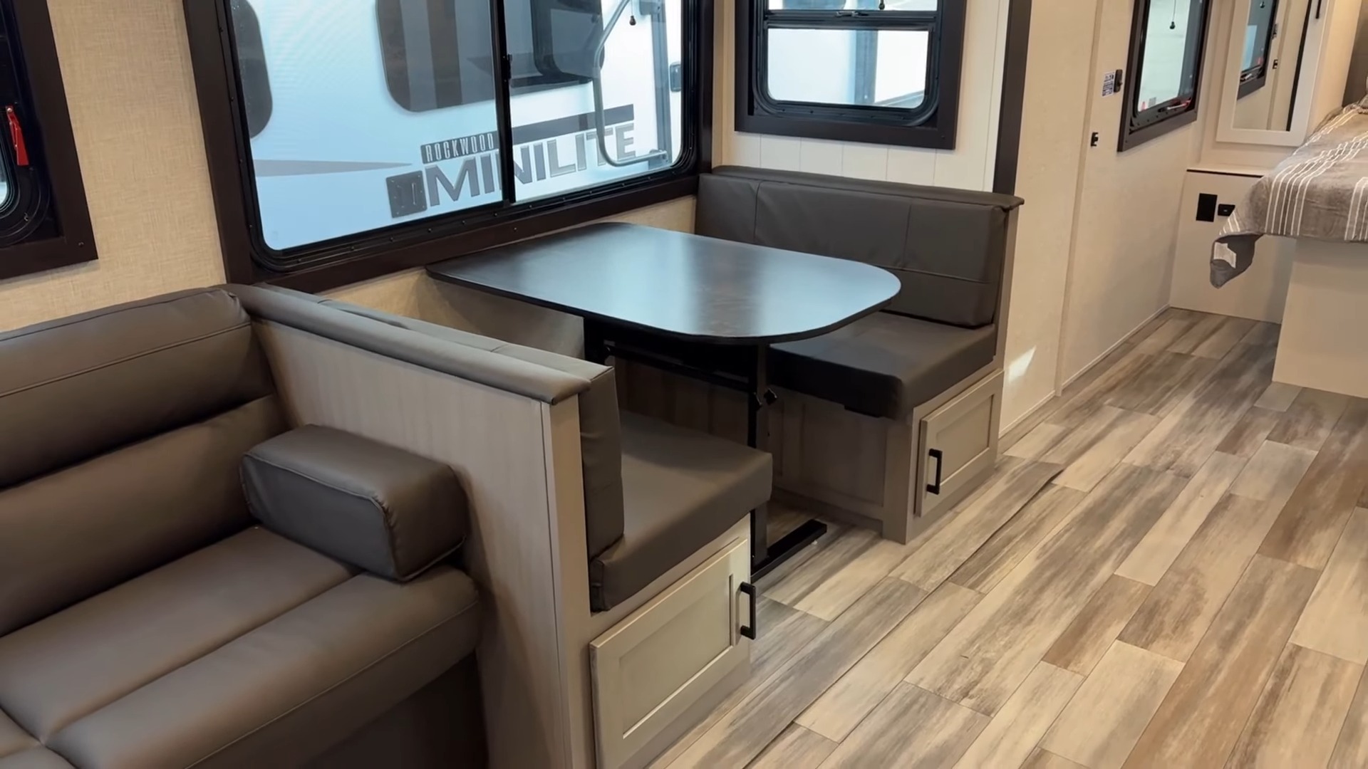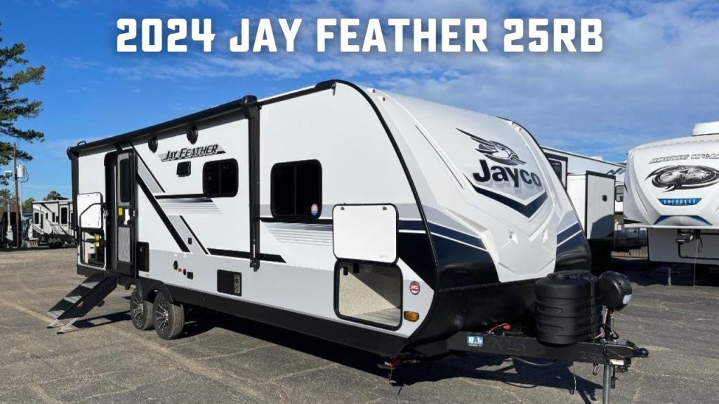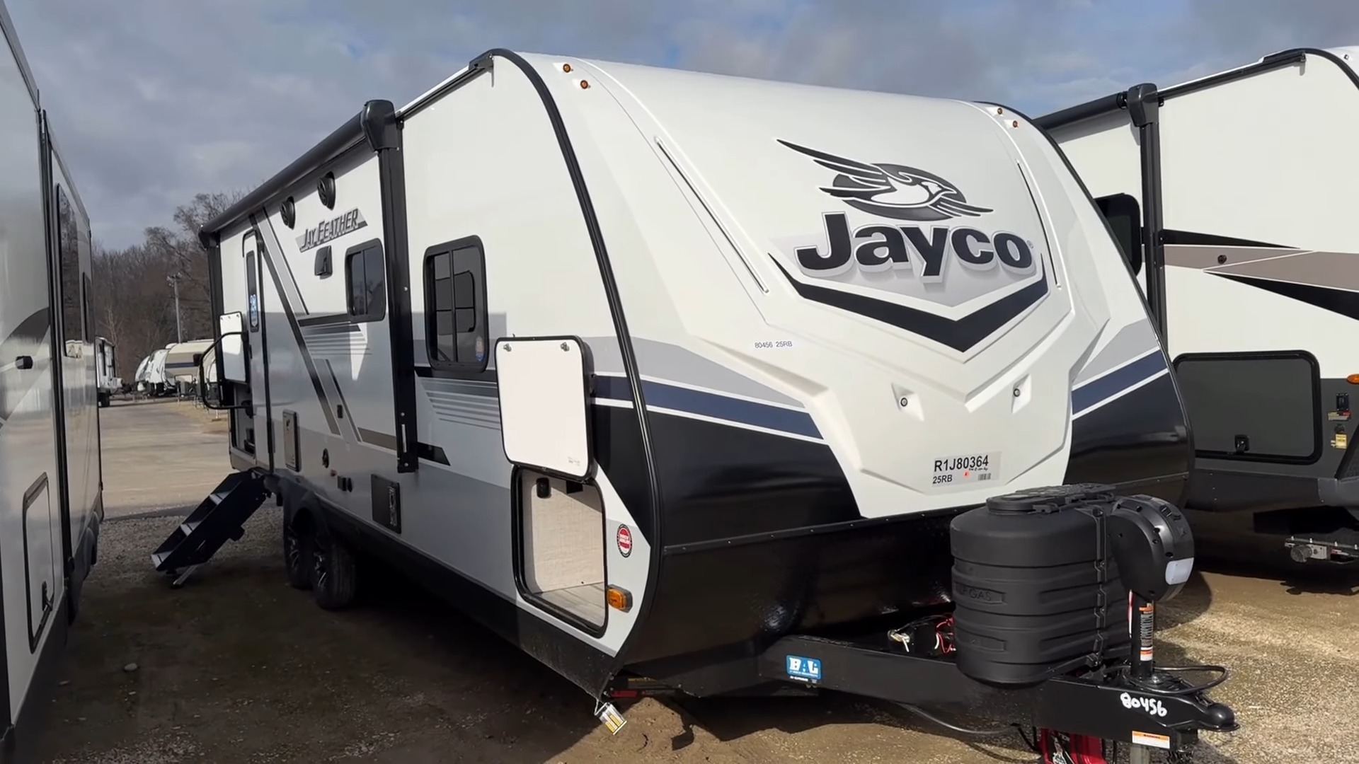 The Jay Feather 25RB RV has been upgraded with cool new features, like a real queen-size bed and a safer table in the dining area.