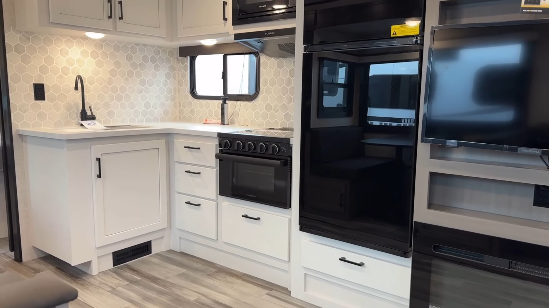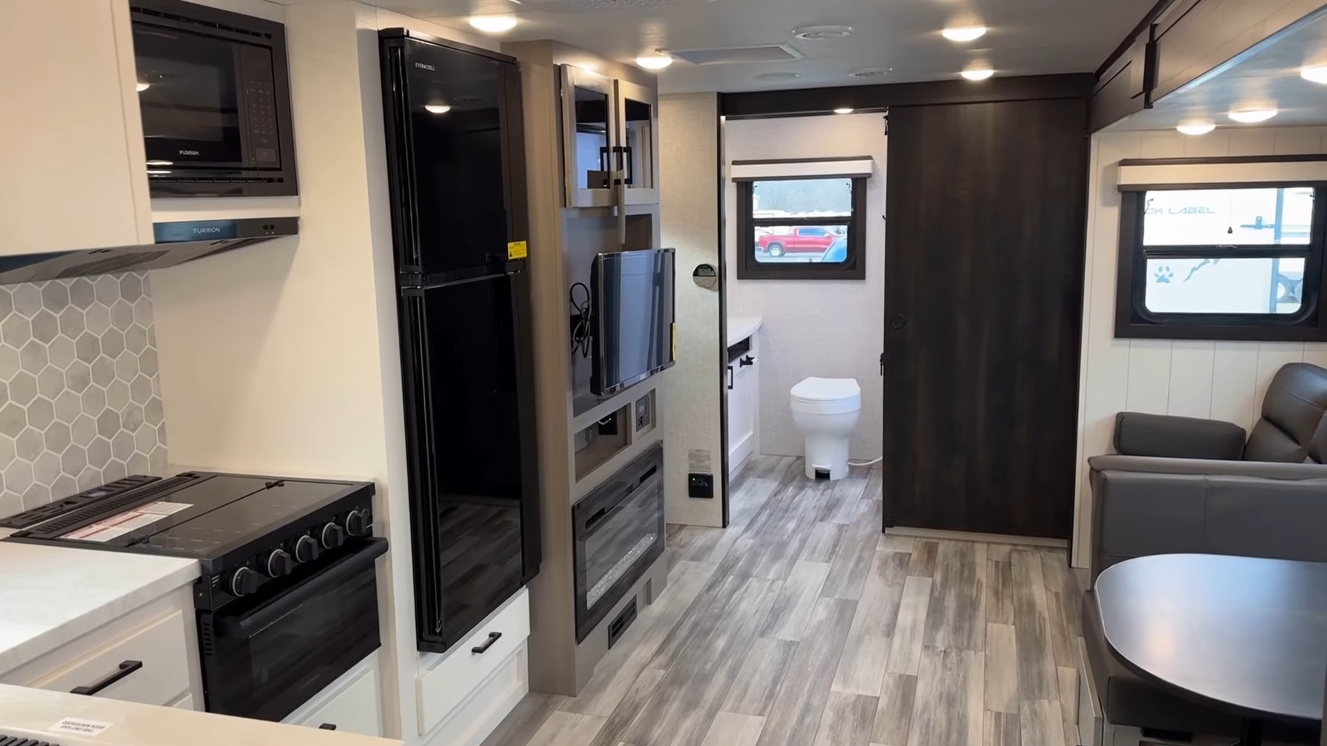 It has a special design called “Vintage Farmhouse” that looks really nice and makes the inside feel cozy and spacious.
