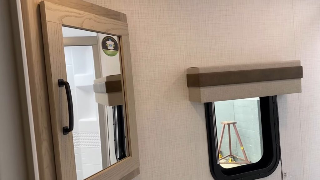 The 2616BH bathroom works well giving RVers enough space to do what they need to do. Forest River did take an interesting route on the sink but like I said – it works. You’ll see in the picture below it’s a very cool rhombus shape! I guess you could say it’s very modern!