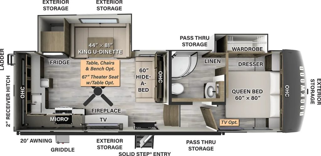 Rockwood is known for its efficient use of space, and the 301RK is no exception. They’ve minimized wasted space, making every square inch count. Wherever there would be empty space, for example behind the fireplace or the fridge, there is access for storage in those spaces.