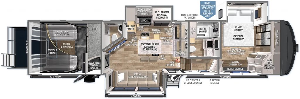 If you don’t need to load the garage, however, this could still be the right RV for you. The garage creates options for adult-sized sleeping quarters, theater and entertaining space, or even office space if you need a quiet place to work.