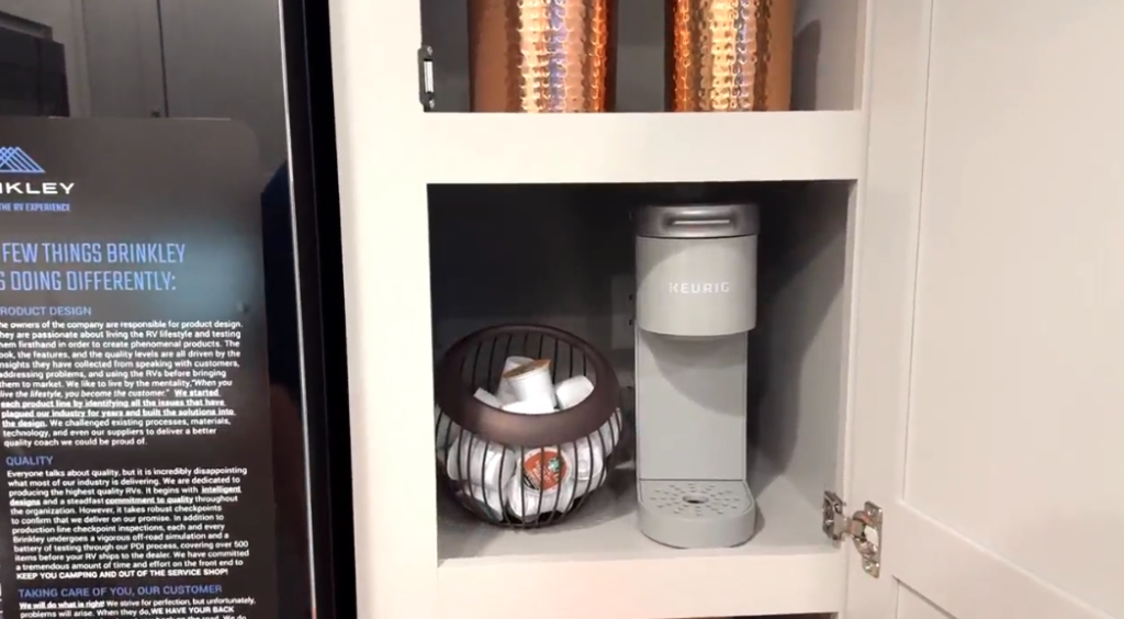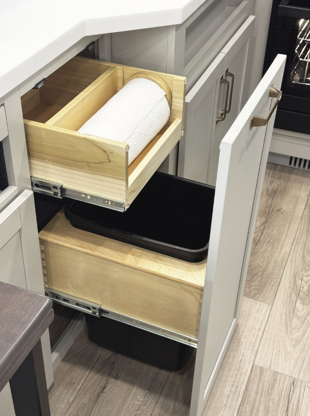 Brinkley’s signature stow-n-go paper towel holder and designated built-in trashcan space.
