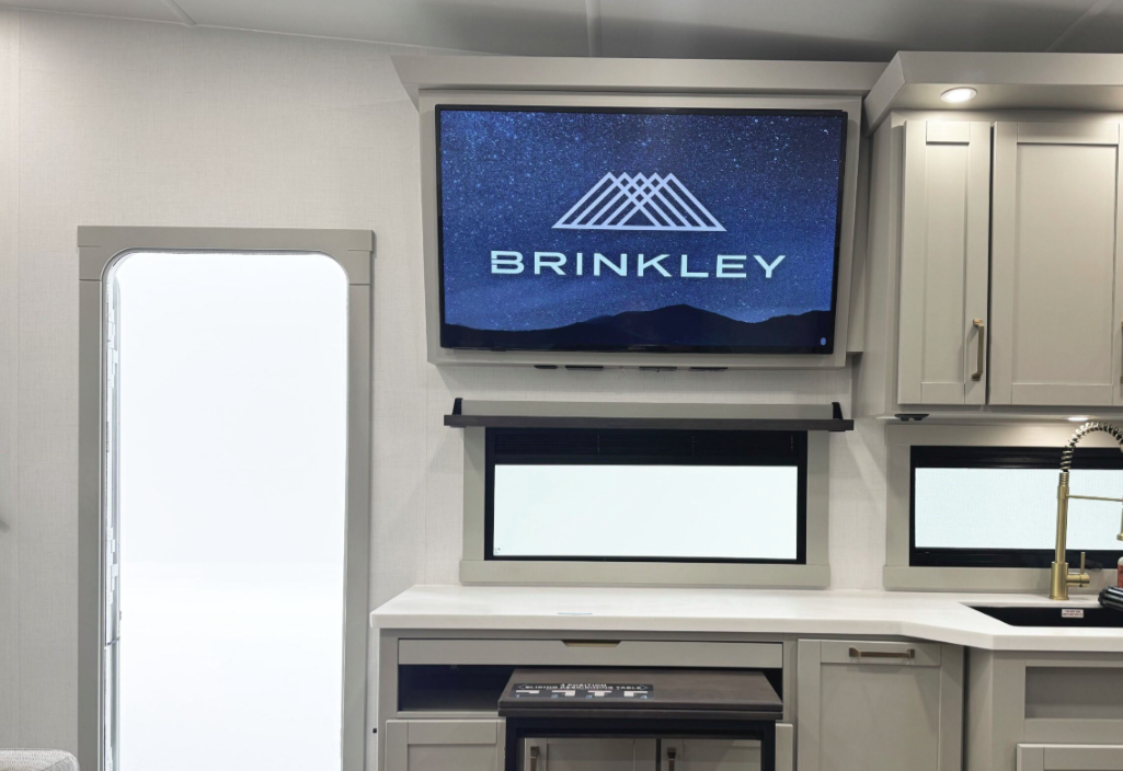 Interior of a luxury Brinkley RV featuring a modern kitchen with light gray cabinetry, white countertops, a black microwave and oven, under-cabinet lighting, a pull-out table, two large windows, and a mounted TV displaying the Brinkley RV logo.