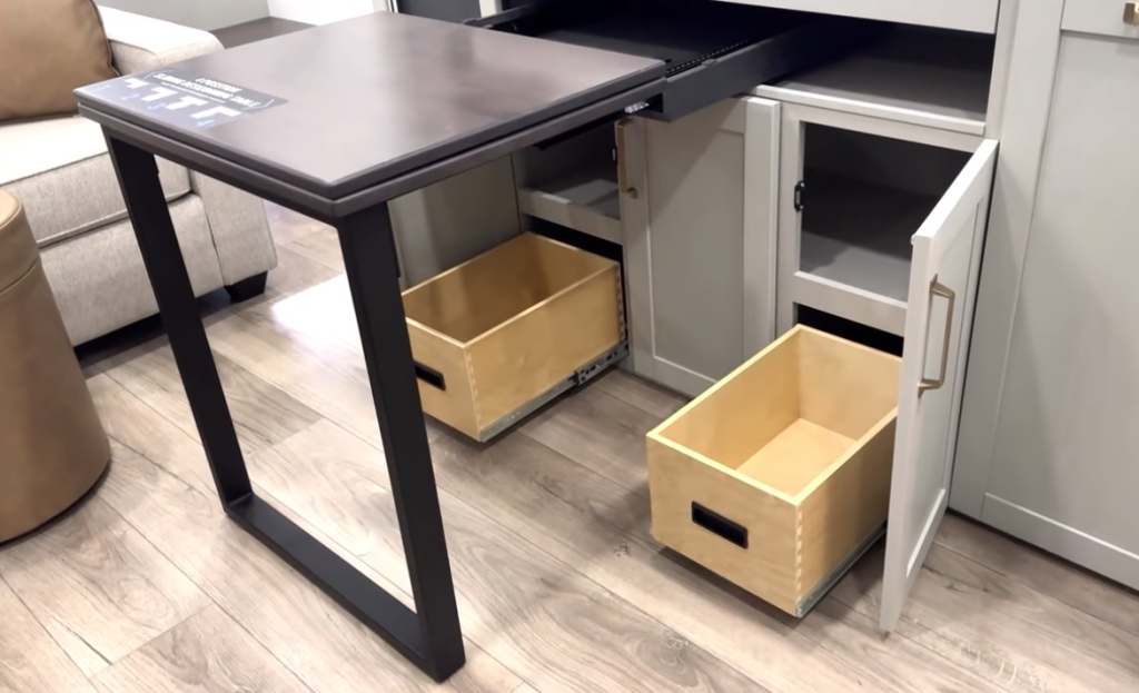 Slide-Out Dining Table: Tuck away when not in use or expand for dinner, games, or remote work. A revision worth mentioning, the rear leaf is now hinged so there’s no need to use additional storage space.