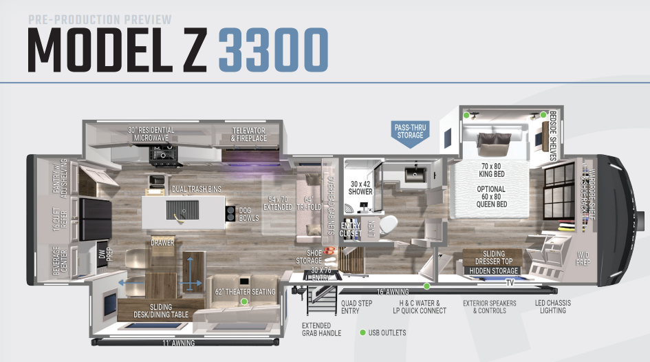 Whether you’re a weekend adventurer or a full-time lover of the open road, the Model Z 3300 is packed with features and amenities tailored to elevate whatever your journey may be.