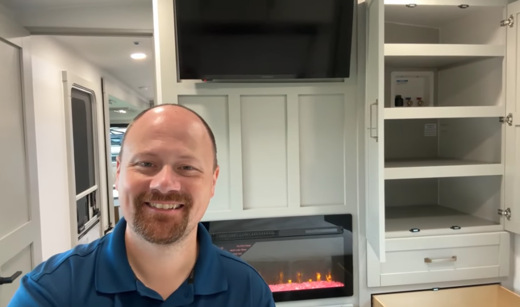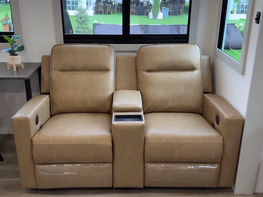 At the heart of this retreat on wheels is a cozy fireplace and a perfectly positioned Smart TV features – combined with the plush heated recliners, it’s an irresistible lounging space