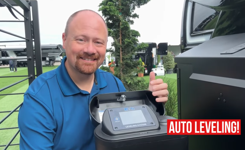 One-touch automatic leveling system conveniently on the tongue of the trailer, providing ease of setup.
