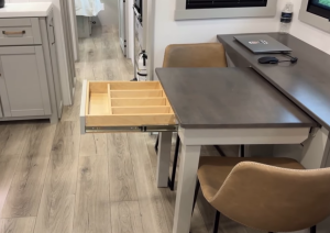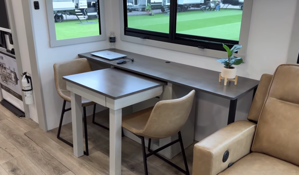 The multifunctioning dinette/desk is adjustable for different uses, including as a workspace or dining area, with power outlets nearby.
