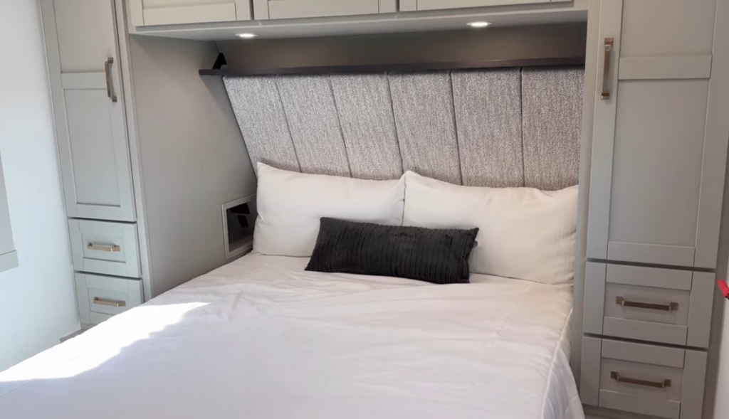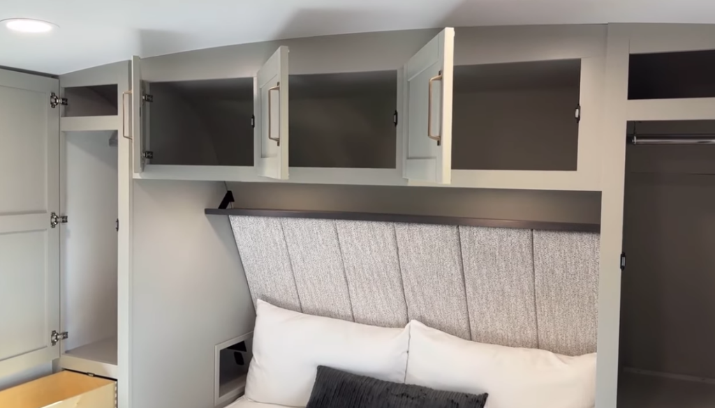 From the barreled 6’9″ ceilings and the soft indirect lighting to the seamless matchup between the wall and the ceiling and strategically placed outlets, this travel trailer is five stars on wheels.
