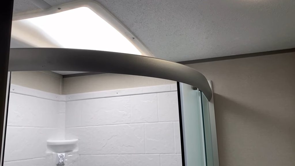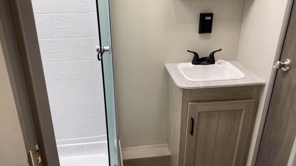 Moving on to the bathroom, you’ll find it has plenty of room to stretch out. The radius shower might take some getting used to, but it’s a smart design choice to save space. The pass-through bathroom design provides privacy, even when guests are sleeping in other areas of the RV. And yes, there’s ample space to do your business comfortably.