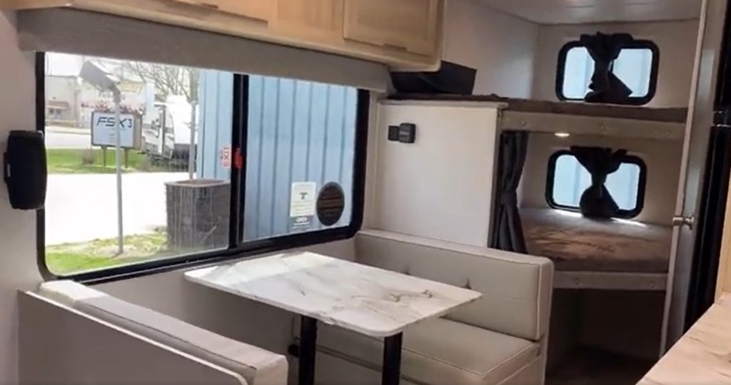 The dinette benches, with their ample storage space, offer the potential to be utilized as a shoe garage, further optimizing storage options. The pass-through compartment at the front of the camper allows for easy access and storage of larger items.