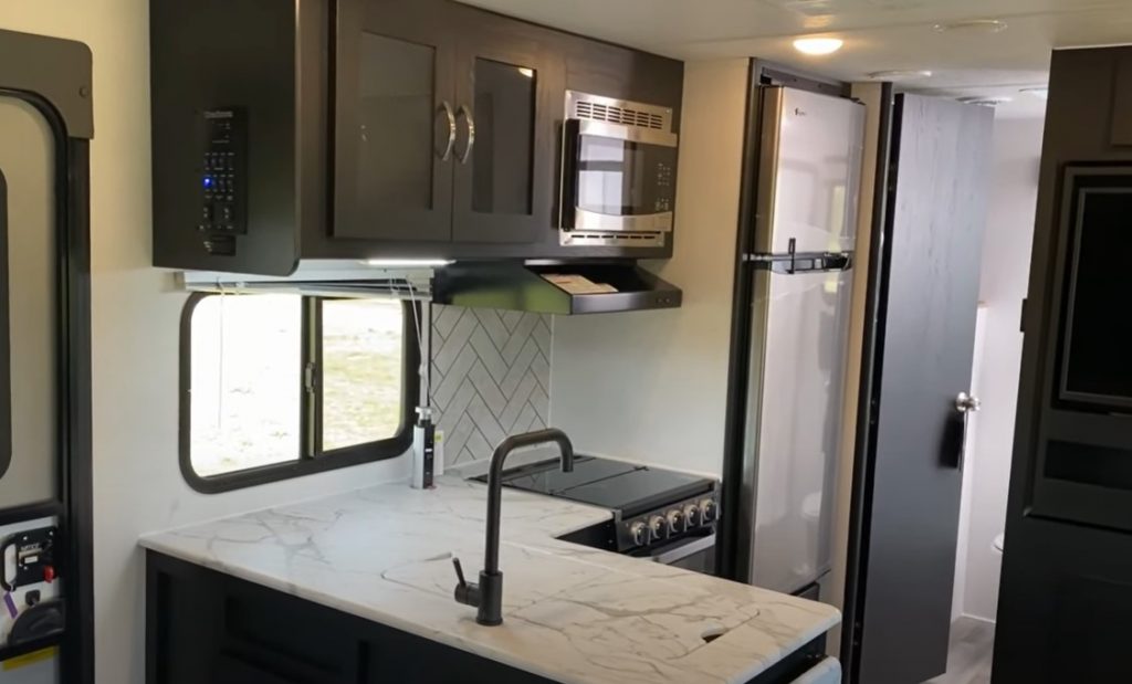 Coachmen has maximized the available space in the Freedom Express 226RBS, demonstrating their commitment to providing ample storage solutions throughout the RV. The L-shaped kitchen not only offers a generous amount of storage but also provides ample workspace for preparing meals.