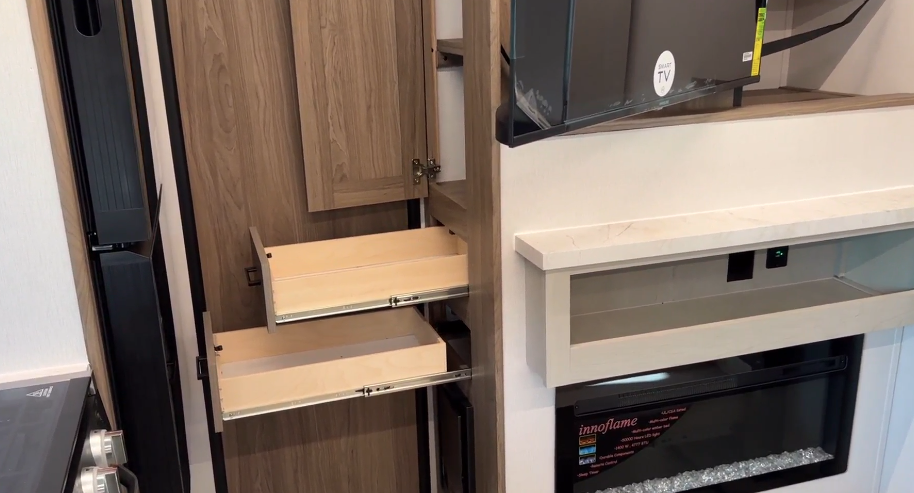 Drawers, drawers, and more drawers. From the pantry drawer space to the extra deep drawers below the dining booth seats – the Freedom Express 252RBS offers unparalleled storage solutions, ensuring that every utensil, gadget, and essential has its place, making your adventures clutter-free and organized.