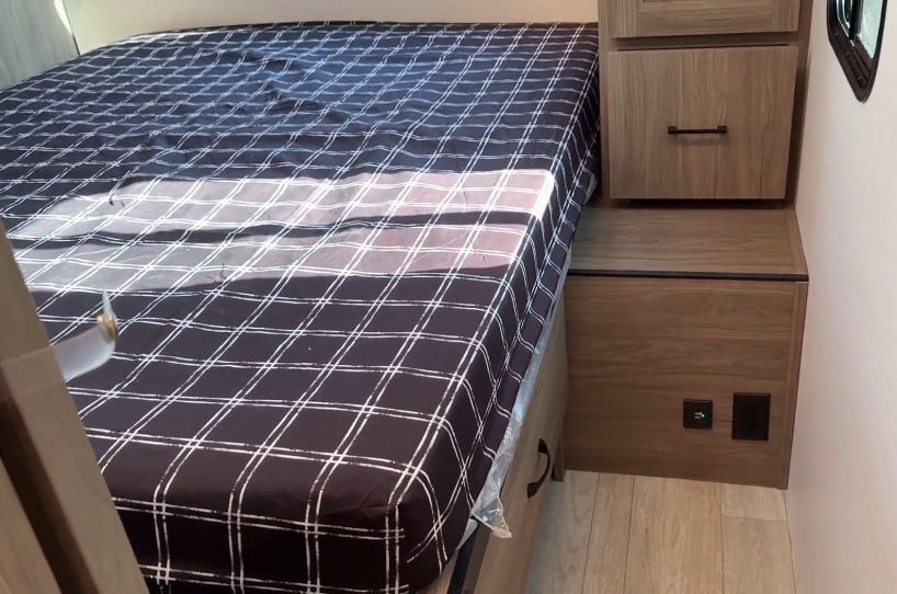 The spacious true queen bed (60″ x 80″) serves as the bedroom’s centerpiece. Built-in wardrobes on each side of the bed provide generous clothing storage, and the overhead cabinets keep daily essentials within reach.