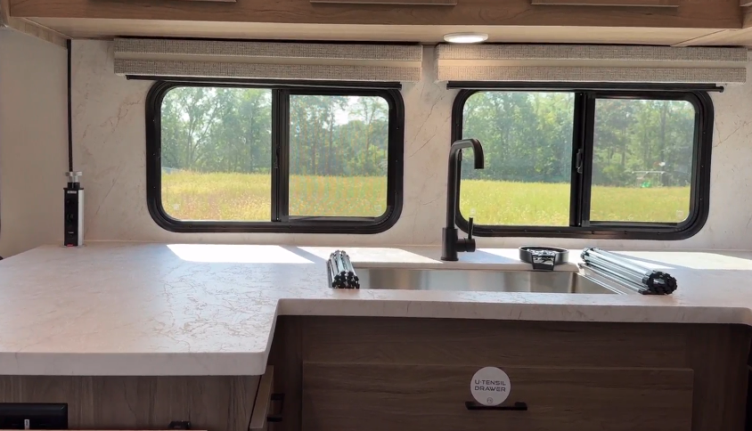 The bathroom is both aesthetic and functional. The porcelain foot-flush toilet and spacious 6’9″ shower make it easier for the taller RVers. Although the fan is a standard 4″ design, the rest of the room’s functionality is top-notch.