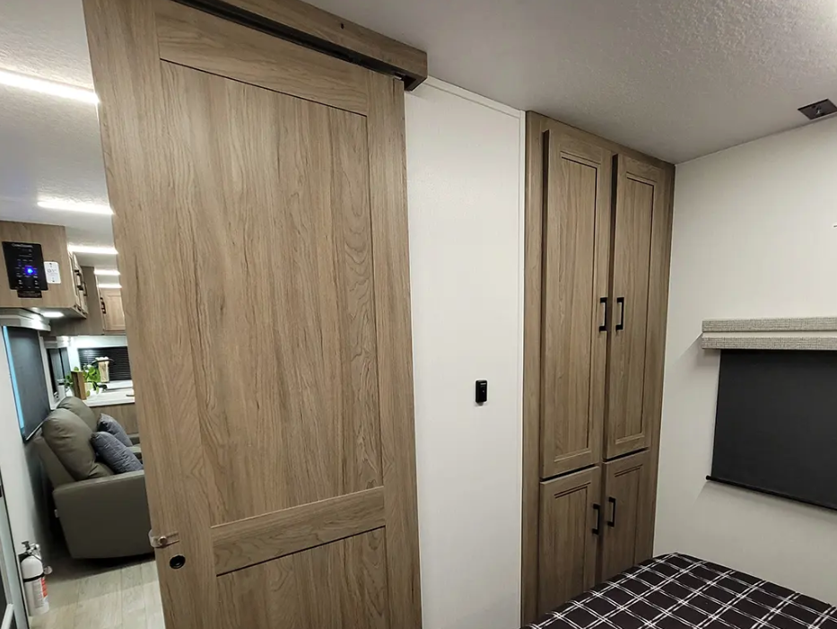 While the room has TV hookups, the placement isn’t ideal, but it’s the best spot given the layout. If you’re looking for a camper that’s tall-person friendly and has storage galore, the bedroom of the Freedom Express won’t disappoint.