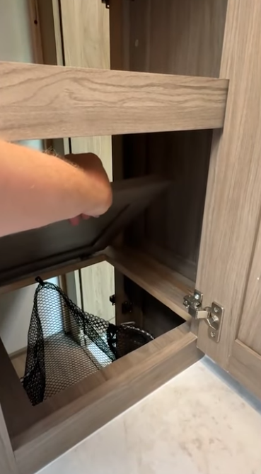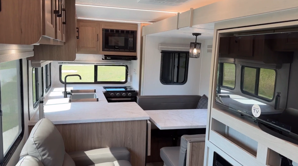 The entertainment center includes a swing-out TV mount, which has been redesigned for 2025 to allow better viewing angles from both the kitchen and dining areas.