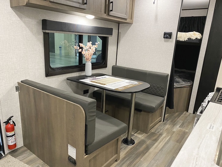 - Large Dinette for family meals and extra seating. Collapsible table; Dinette folds out into a bed. Spacious storage area beneath each seat.