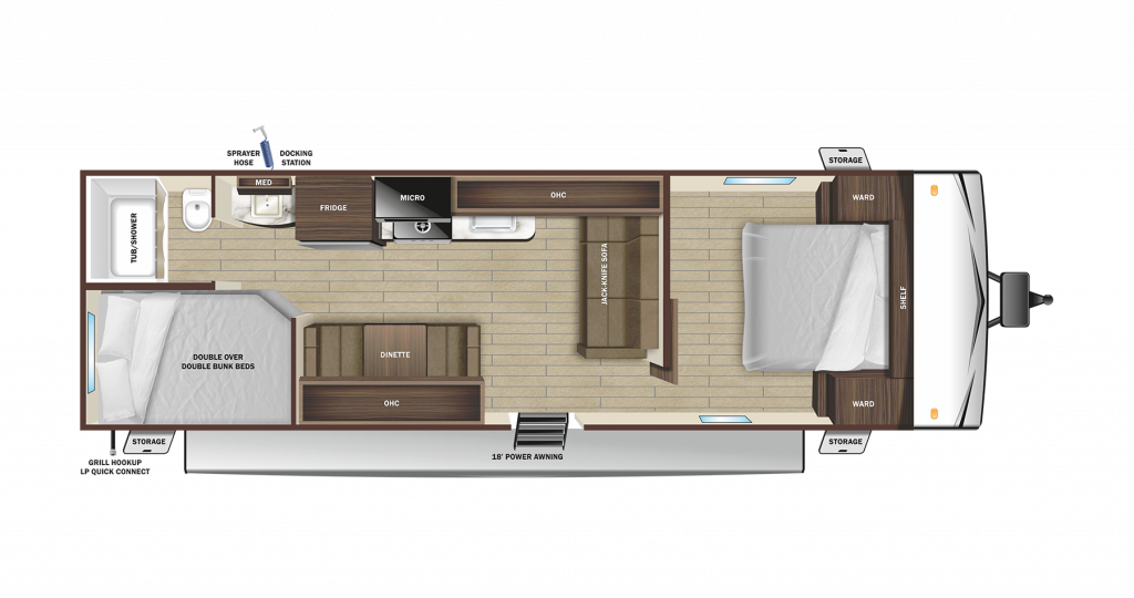- Jack Knife Sofa: This comfy sofa sits against the front privacy wall. It easily folds out into a bed when it’s time for lights out. It also has a big storage area beneath it.