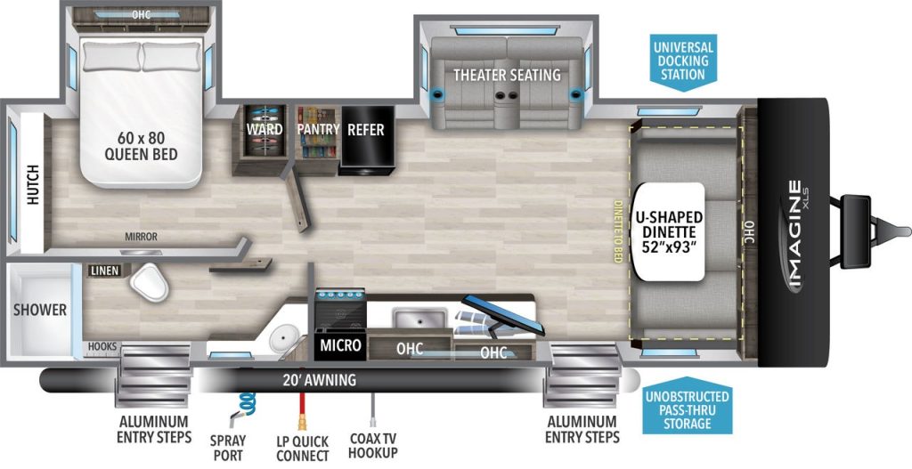 The 25DBE is in the Imagine XLS series. This camper features double-over-double bunks, windows on the campside, and theater seating that face over to the slide with your entertainment.
