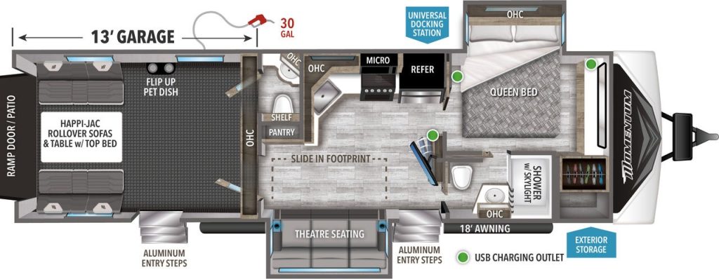 This camper is like a beefed-up version of the 14MS (as seen above) with a massive dinette and a bed slide across from the bathroom that allows the trailer to come in under 30′, have a private bed, and still leave access to the bathroom while the slides are closed.