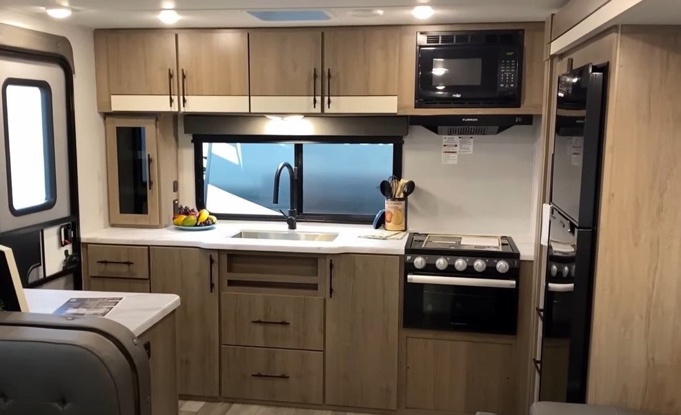 - Sealed edge thermofoil countertops throughout the RV (6:00)