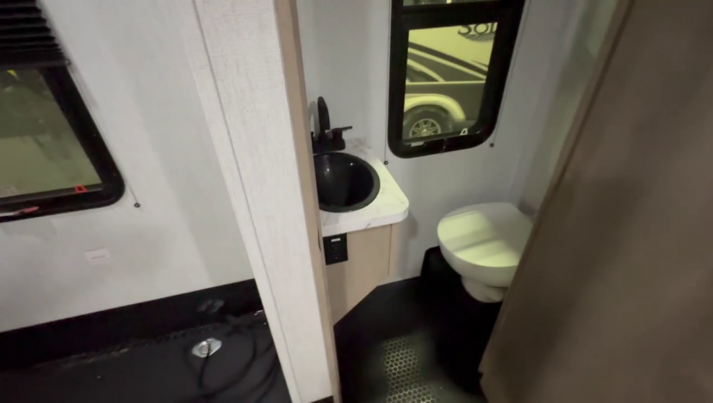 Some 395MS models also have the world’s smallest half-bath! (Okay, maybe it isn’t really, but it’s a contender!) No, it isn’t very plus-size friendly, but it’s a great place to send your kids or guests to drop a stinky deuce, rather than having them handle business in your own personal toilet. This area has a sink, a porcelain toilet, and a mirror.