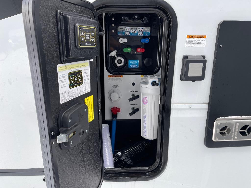 The all-in-one utility center with a water bay allows you to hook up to city water all in one space. Once it’s time to leave the campsite, all of the flush and dump valves are also located in this utility center. This Momentum has a 155 gallon fresh water tank capacity, and a 104 gallon grey and black water tank capacity–some of the largest RV tanks!