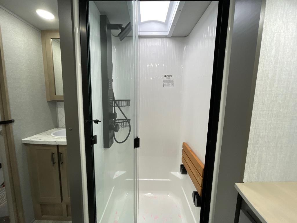 The shower is also much larger and makes a typical travel trailer shower look and feel fun-sized.