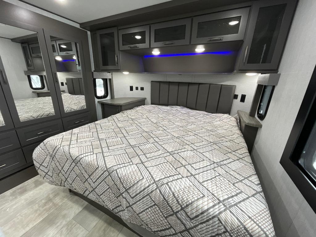 There is more storage underneath the bed. The 395MS comes with a queen sized bed, but if you do feel the need for a king, you can option that in.