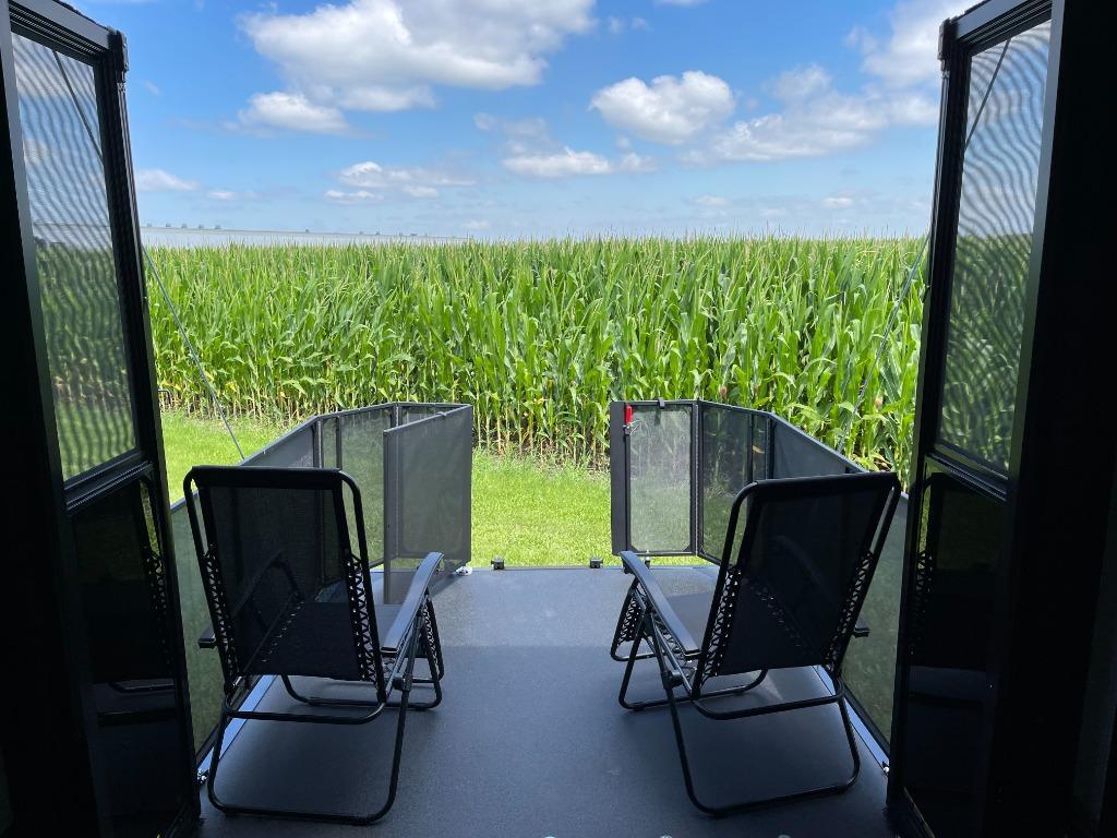 Heading out of the garage onto the patio, there are, as previously mentioned, features that make it great for lounging around and relaxing in comfort. The patio awning spans the total length of the patio deck. There are also sliding porch doors that allow for easy access in and out of the camper. These doors are easy to set-up and transform, so however you decide to use them, you can easily configure the doors to suit any need.