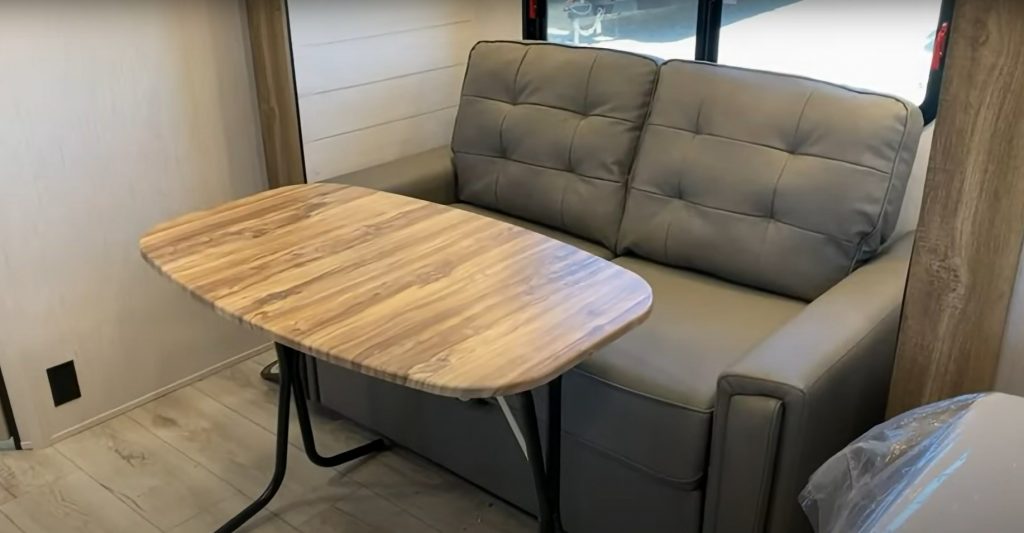 This innovative addition combines a jackknife sofa with a foot chest extension, providing a versatile solution that can serve as both a comfortable seating area and a sleeper. Furthermore, the inclusion of a free-floating folding leg table gives you the option to use the couch as a dinette.