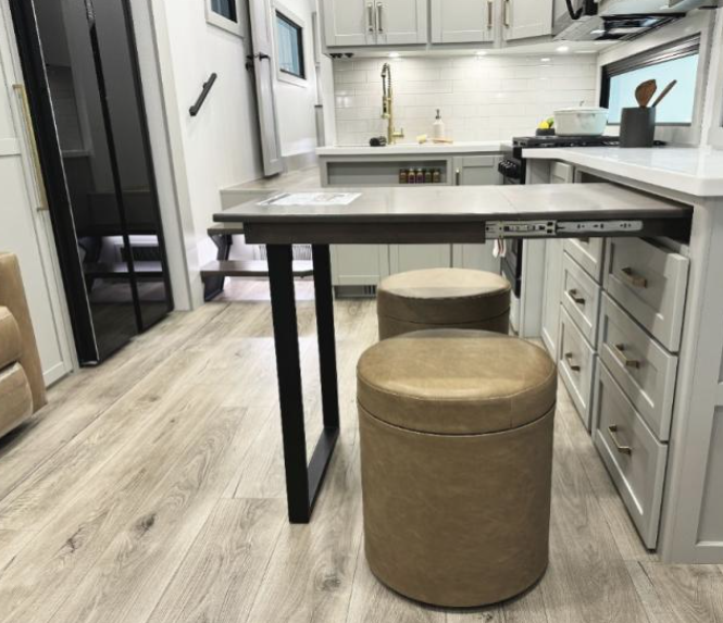 This kitchen is nothing short of versatile, functional, and aesthetically pleasing! Throughout the RV, you will find clever storage features, from the under-sink storage for the extra table leaf to the space beneath the extended kitchen counter.