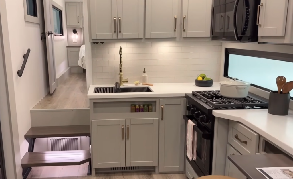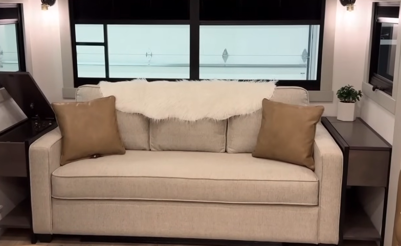 The framework around the drawers can be removed to accommodate a combo washer-dryer unit, adding to the RV’s versatility.