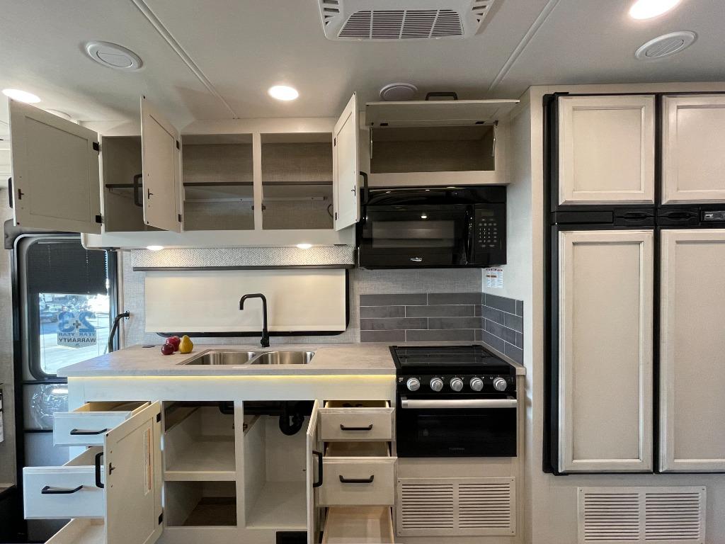 The Jayco Greyhawk 29MV offers a generous amount of storage space to accommodate all your belongings. The overhead cabinets, which are pocket screwed, ensuring durability and longevity, provide convenient storage for kitchen utensils, pantry items, and personal belongings.
