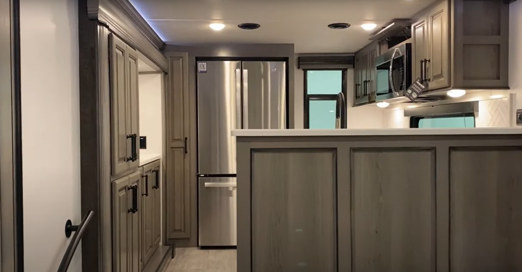 - The kitchen features ample cabinet space including a large pantry and a tall closet with an outlet in case you need to charge a battery powered vacuum. The cabinets are all soft-close with magnet clips instead of the cheap clips typically used in RVs.