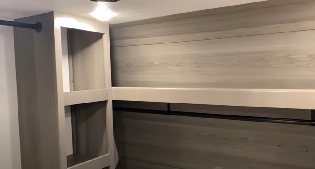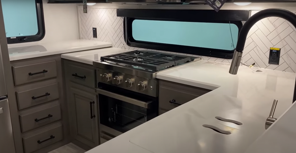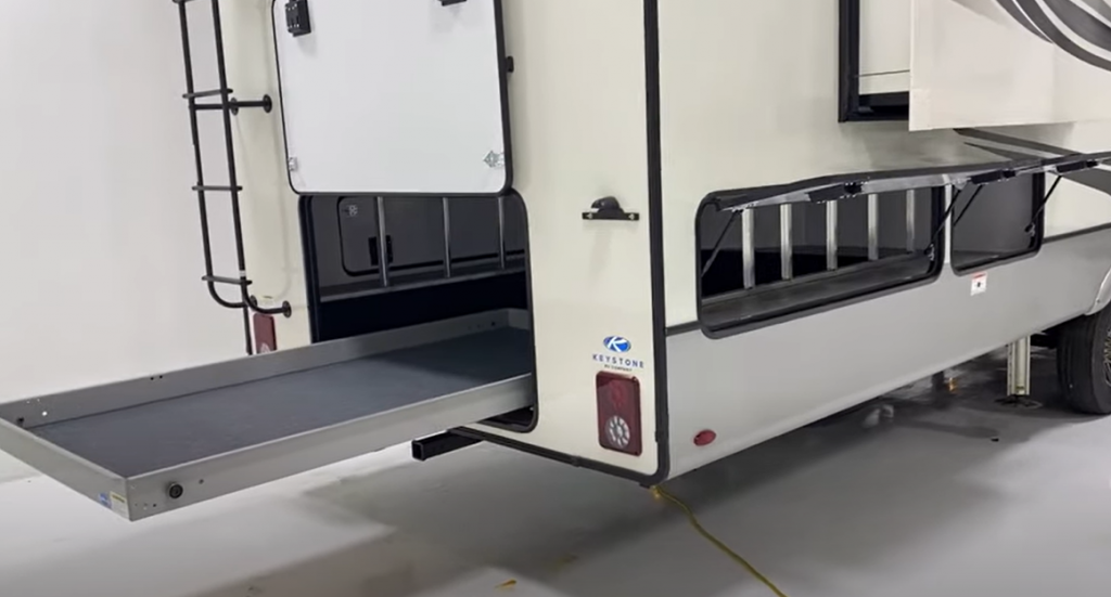 - A MASSIVE storage area with a storage drawer in the back of the RV beneath the kitchen.