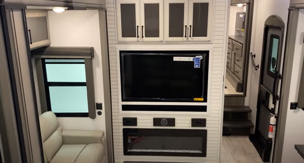 The 4K Smart TV sits mounted above an electric fireplace, creating a welcoming and entertaining space for relaxation. Above the TV you’ll find additional cabinet space to store your belongings.