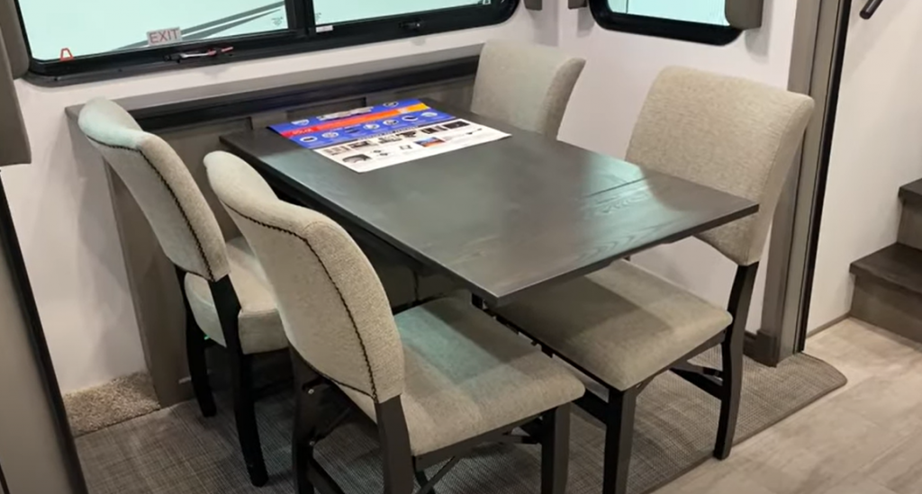 The Keystone Montana 3901RK boasts a middle living area that deviates from the common theater seat and double hide-a-bed configuration. Instead, the Montana 3901RK features a dining table and chairs.