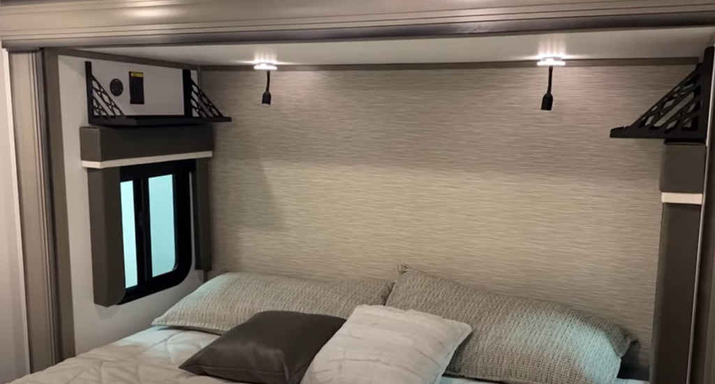 - A 12-volt ceiling fan and 12-volt rain-sensing vent fans throughout the RV for optimal ventilation.