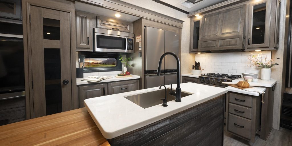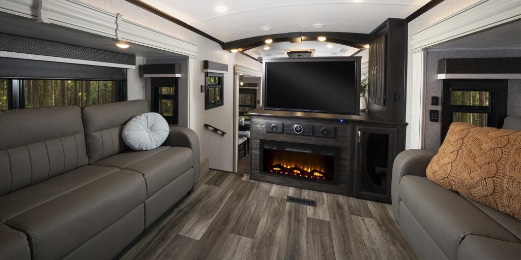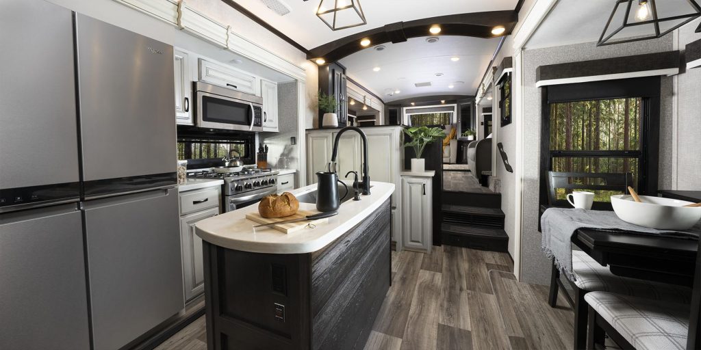 North Point RVs are classy fifth wheels with a taste of modern touches. Exquisite is a good word, but also kind of an “I’m formal . . . but I’m here to party” look. The modern black, white, and gray color is very appealing to a wide audience.