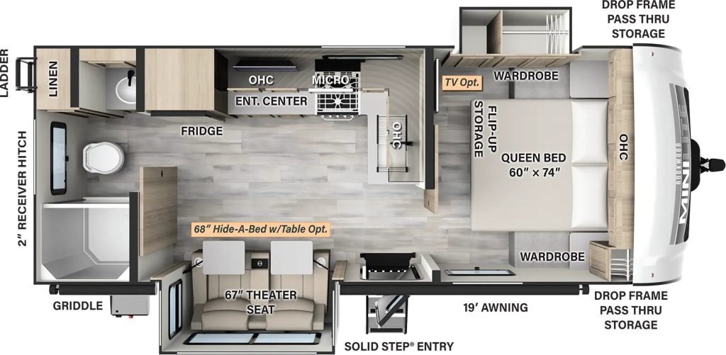 You’ll also appreciate the storage options, including a spacious front storage compartment. The underbelly is enclosed and features a radiant barrier for added insulation.