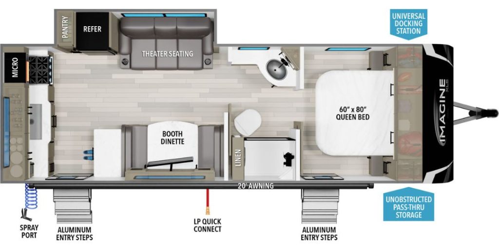 This compact, large kitchen floor plan got started with the Grand Design Imagine 17MKE. It’s since become a staple couple’s camper layout.
