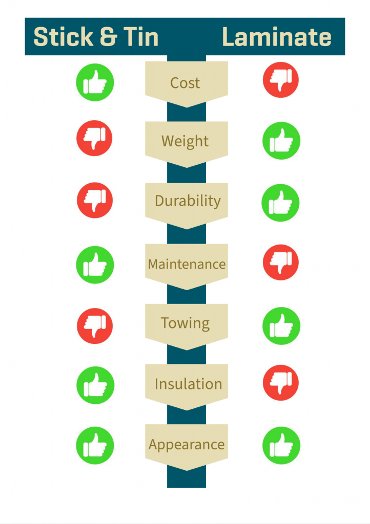 After reviewing the PROS and CONS for both stick and tin and laminate construction types, you will be able to confidently determine which RV construction type is best for your next camper purchase. Read on!